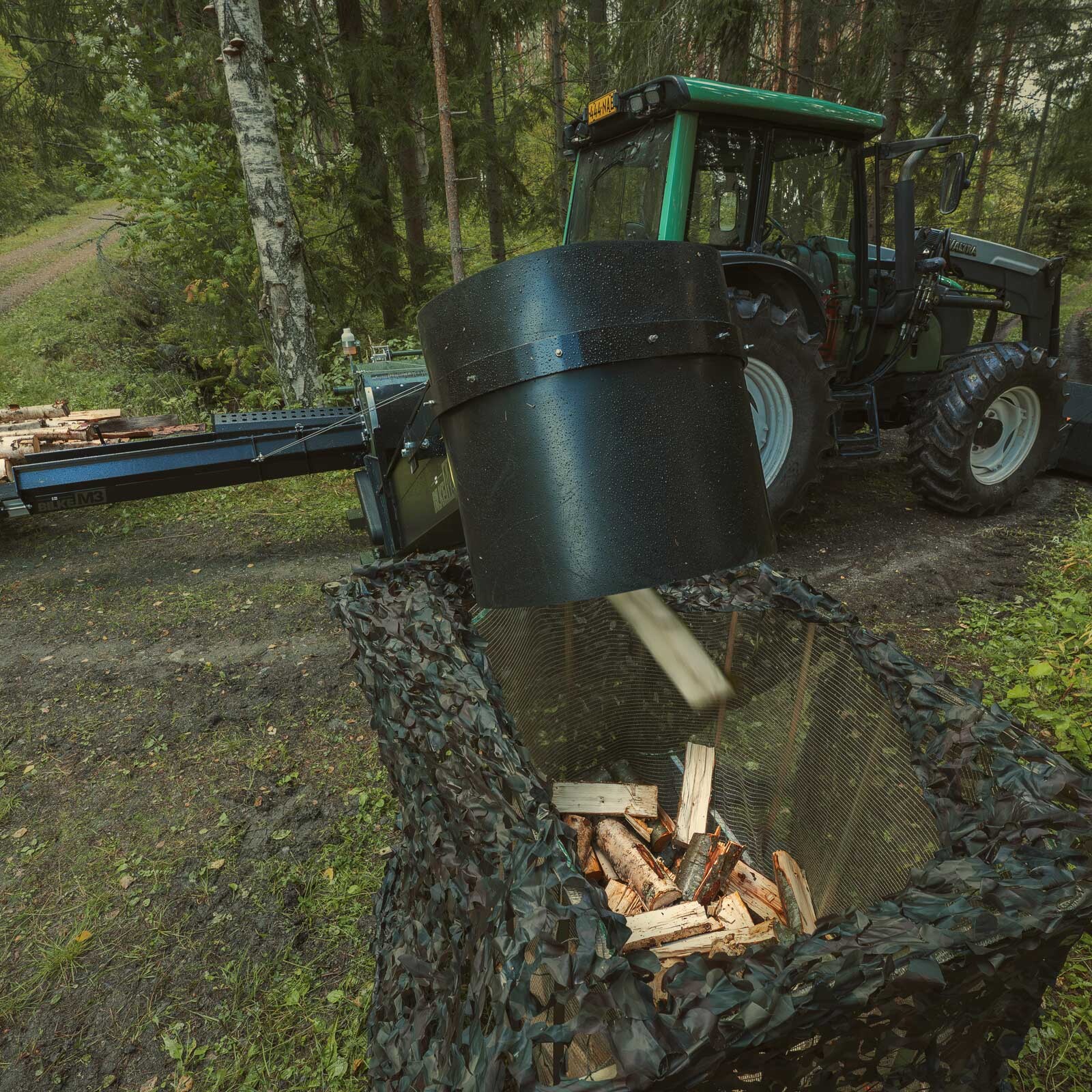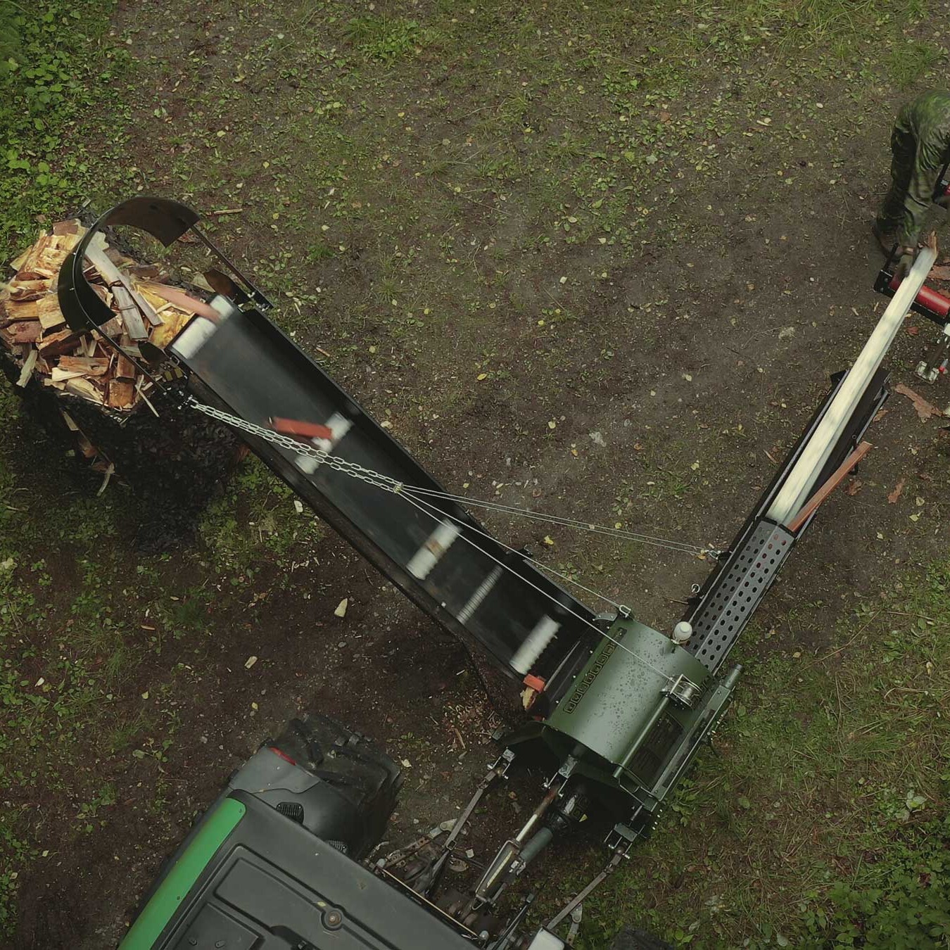 ohjaat halkaistut klapit täsmällisesti haluttuun kohteeseen – esimerkiksi säkitystelineeseen, laatikkoon tai muuhun tilaan – ilman että klapit leviävät laajalle alueelle.