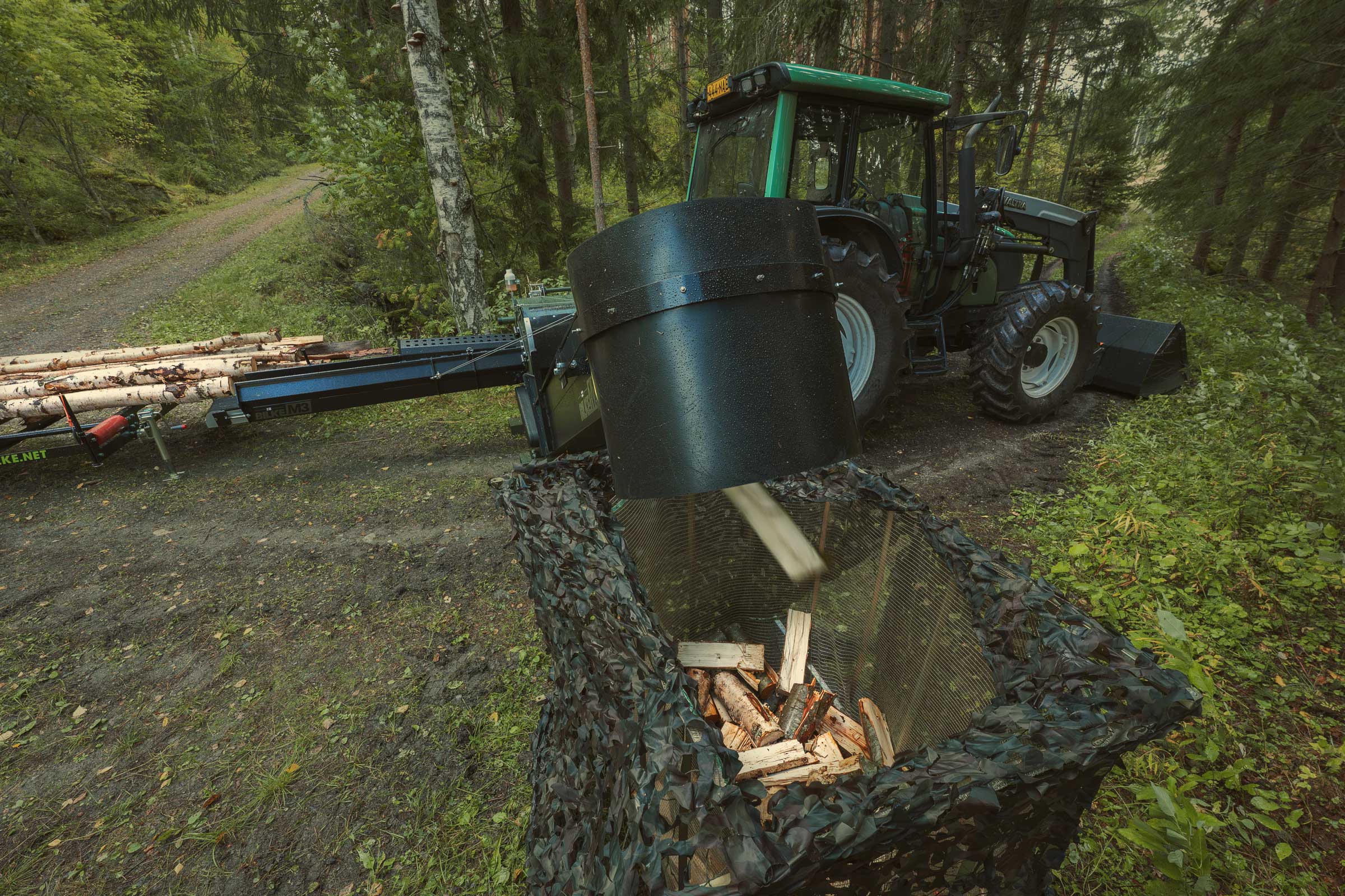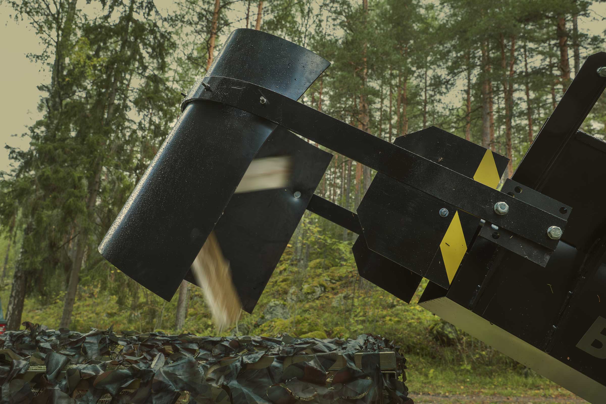 ohjaat halkaistut klapit täsmällisesti haluttuun kohteeseen – esimerkiksi säkitystelineeseen, laatikkoon tai muuhun tilaan – ilman että klapit leviävät laajalle alueelle.