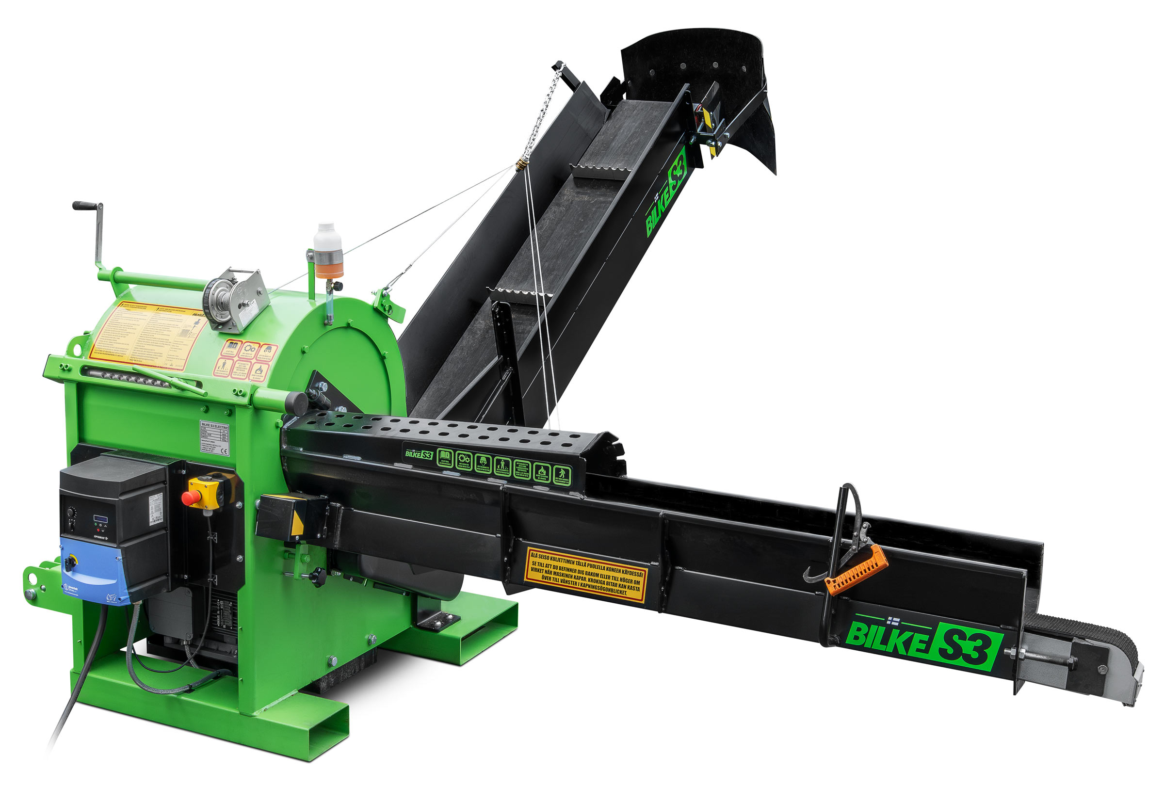Tack vare det automatiska matningssystemet behöver du inte stötta stammen under matningen. Lättflyttade transportband, ett brett utmatningsband och en omdesignad kniv säkerställer bekväm användning. Att arbeta med Bilke S3-vedmaskinen är både enkelt och säkert.